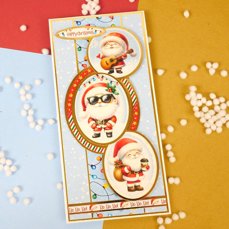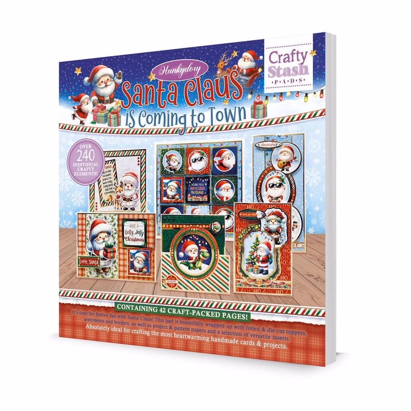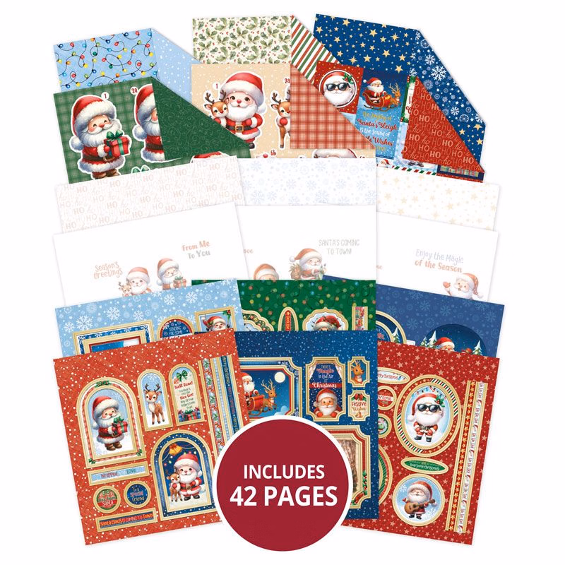 Get ready for Christmas as Santa Claus is Coming to town! This Festive Crafty Stash Pad, features an adorable Santa Claus getting up to all sorts as we head toward Christmas, including decorating the tree, chilling out, getting his Santa suit ready for the big day, going down the chimney, riding his sleigh (and a motorbike), skating and so much more. Plus there are speciality snowglobe-shaped toppers to create a festive 3D centrepiece to add extra creativity to your makes. Finished with Rich Gold foiling throughout, the sweet toppers are accompanied by sentiments, borders, tags and more, as well as the double-sided papers which, on top of a range of stunning patterns, include extra elements such as decoupage, small toppers and sentiments. The festive colour palette focuses on bold classic colours, complimenting and tying this collection together perfectly. Everything matches and co-ordinates perfectly so you can mix and match all the artwork to create showstopping cards for a range of recipients for Christmas.
