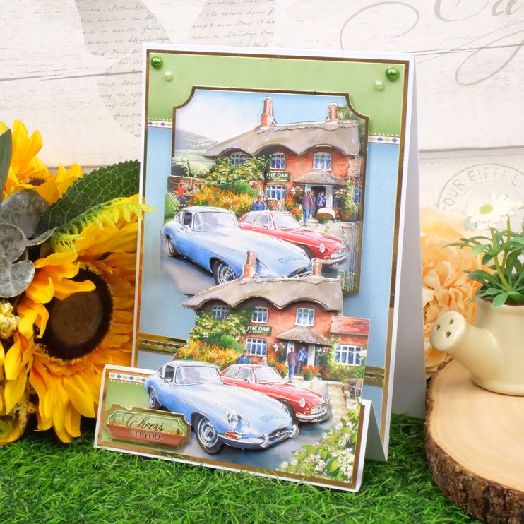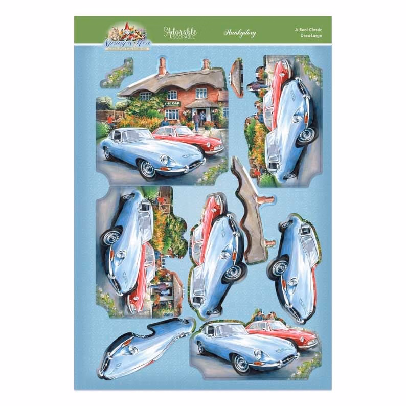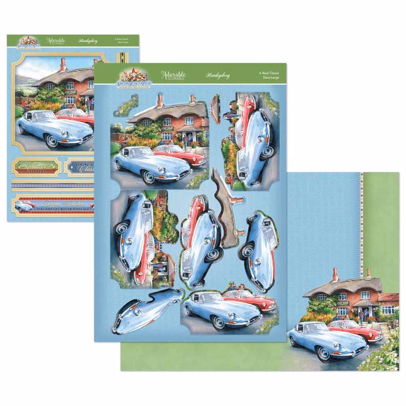 This Deco-Large set includes 1 A4 deco-large elements sheet, 1 A5 base layer & 1 A4 printed cardstock sheet; enough to make at least 1 card, although savvy crafters could easily stretch this set to create 2 or more cards. Imagery features a classic car scene.