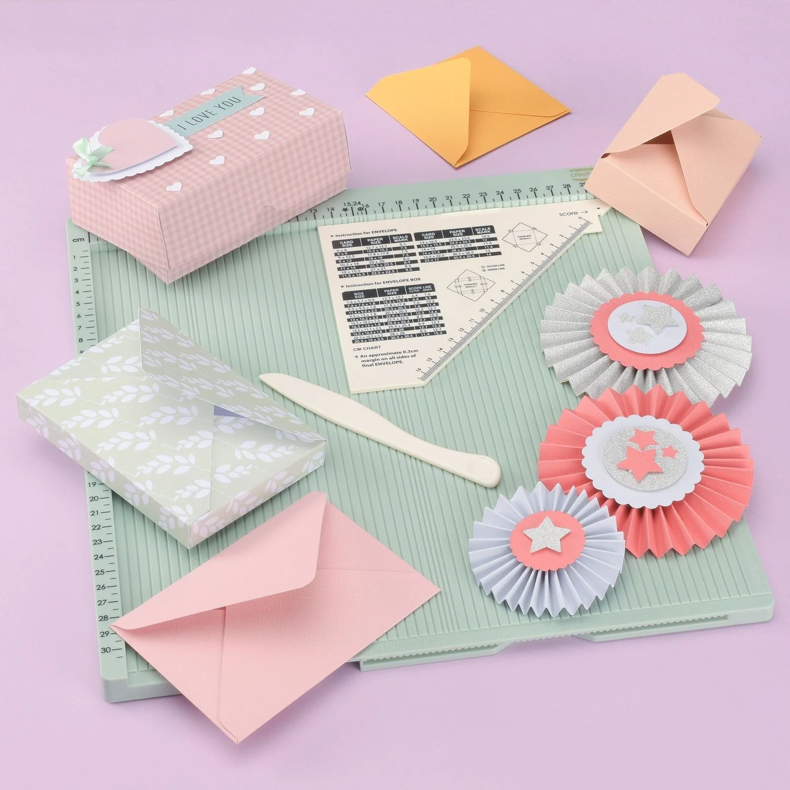 Create your own cards, envelopes, and gift boxes with the Score Easy scoring board from Vaessen Creative. This essential tool is perfect for anyone who loves working with paper. The scoring board allows you to effortlessly create crisp fold lines and score paper without tearing. Thanks to the handy ruler with clear markings and symbols (star, heart, and smiley), you can easily make cards, envelopes, and gift boxes. The symbols indicate additional score lines, such as a perfect centre fold for scrapbook paper, a folding line for A4 and A5 paper, and a score line for an A5 gatefold card. The meaning of the symbols is explained on the included triangular ruler.